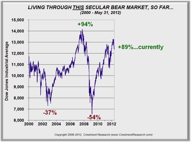 But returning to being serious…yes, we believe that we are approximately midway through a secular bear market. Why do they call it “secular”? It is loosely derived from the old latin word for “era” so a secular bear market is a market for our era…in other words, for too long. The last secular bull market ran from the early 80s to the late, late 90s and a bit beyond but it ultimately crashed when the inevitable pin came in contact with a very large technogoly/internet inflated bubble.